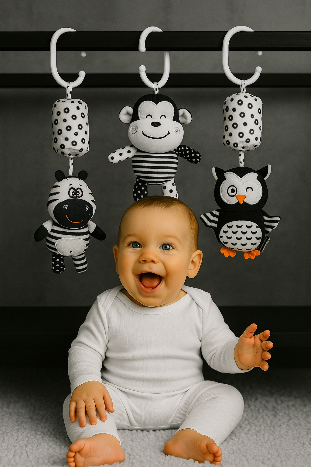 Zawieszka Edukacyjna z Grzechotką Krówka Kontrastowa zabawki dla niemowląt
