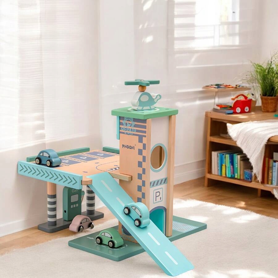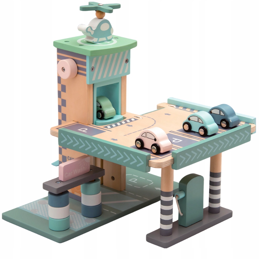 Drewniany parking piętrowy Merkan to nowoczesna, starannie zaprojektowana zabawka, która łączy naturalny urok drewna z funkcjonalnością rozbudowanego garażu dla małych fanów motoryzacji. Konstrukcja składa się z kilku poziomów, dzięki czemu dziecko może tworzyć własne sceny z ruchliwego miasta, zarządzać ruchem pojazdów i bawić się bez końca. Zestaw wyposażony jest w windę, stację paliw oraz specjalnie zaprojektowane miejsca parkingowe, które sprawiają, że zabawa staje się bardziej realistyczna i angażująca. Drewniane autka oraz helikopter dołączone do zestawu pozwalają rozpocząć zabawę od razu po otwarciu pudełka. To idealna propozycja dla rodziców, którzy szukają zabawki trwałej, estetycznej i rozwijającej wyobraźnię dziecka