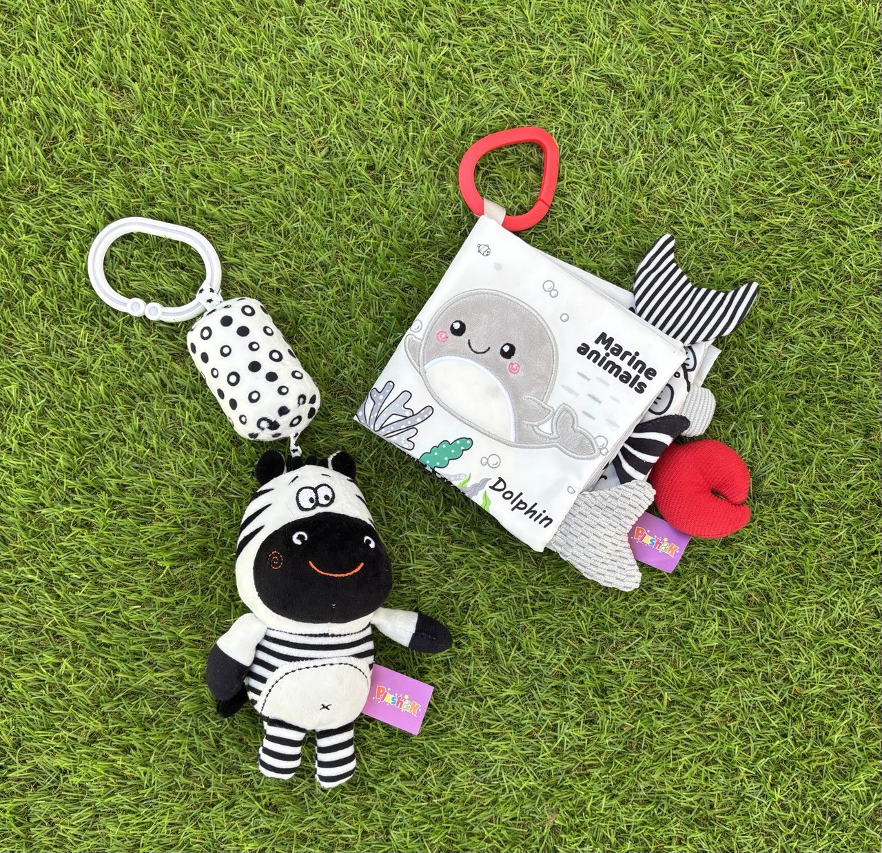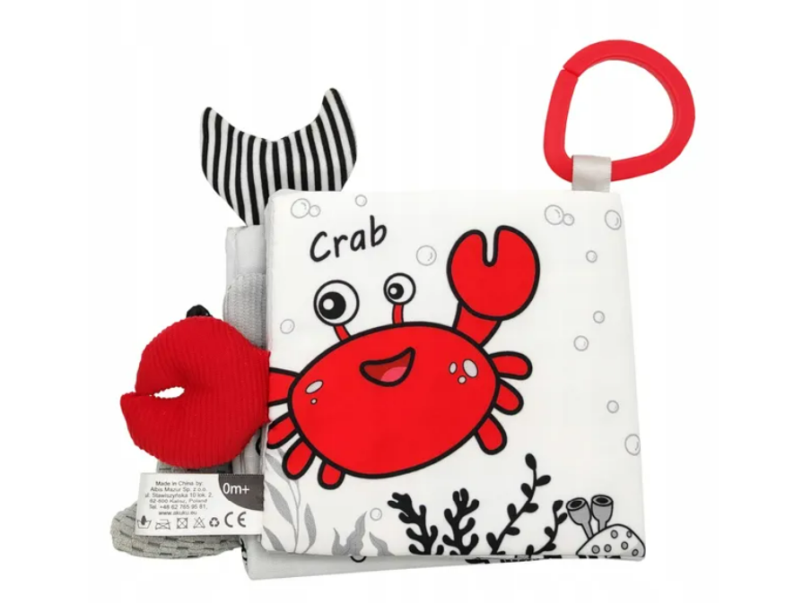 Wprowadź swojego maluszka w fascynujący świat podwodnych zwierząt dzięki miękkiej, czarno-białej książeczce „Morskie Odkrycia”.