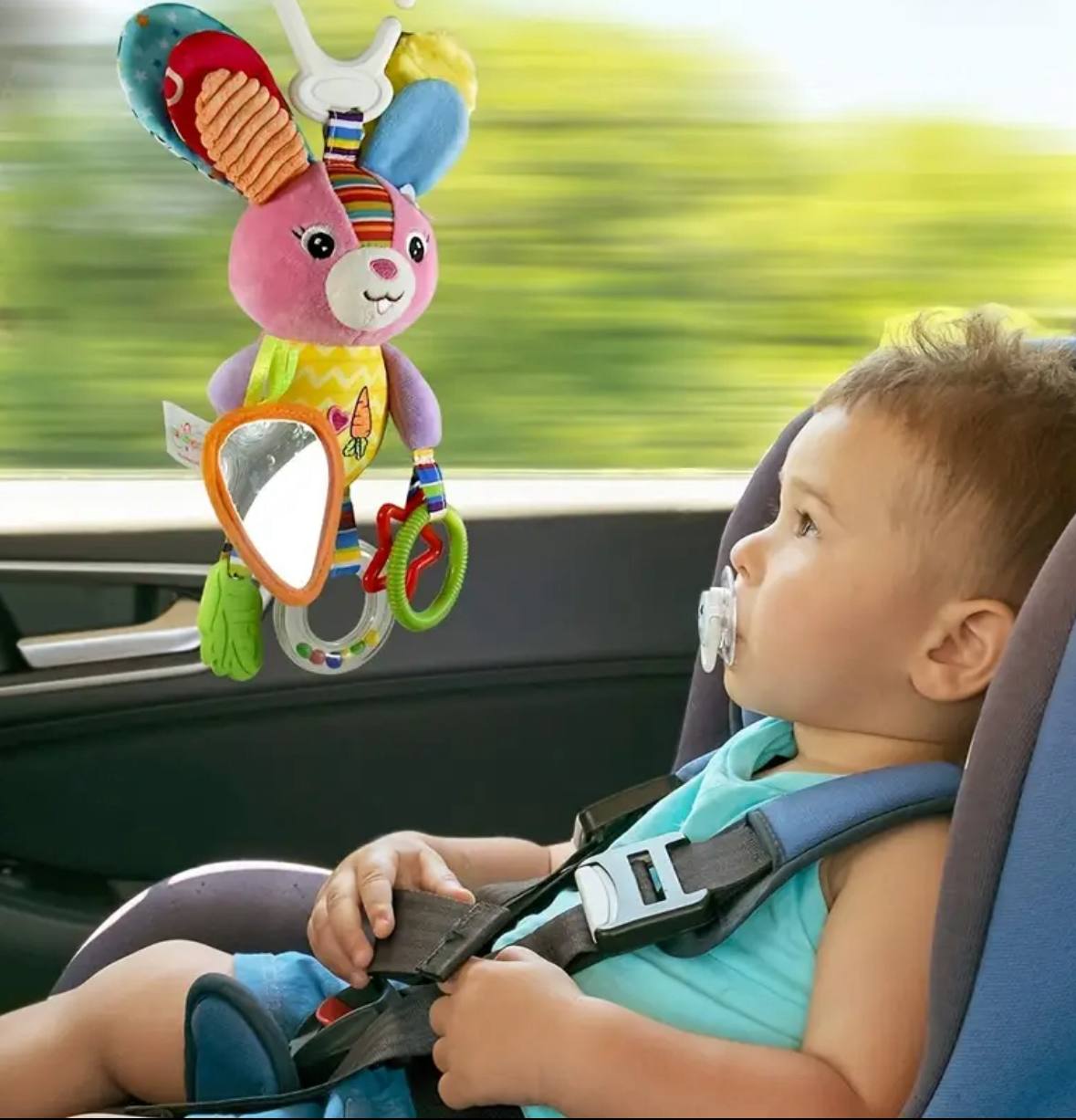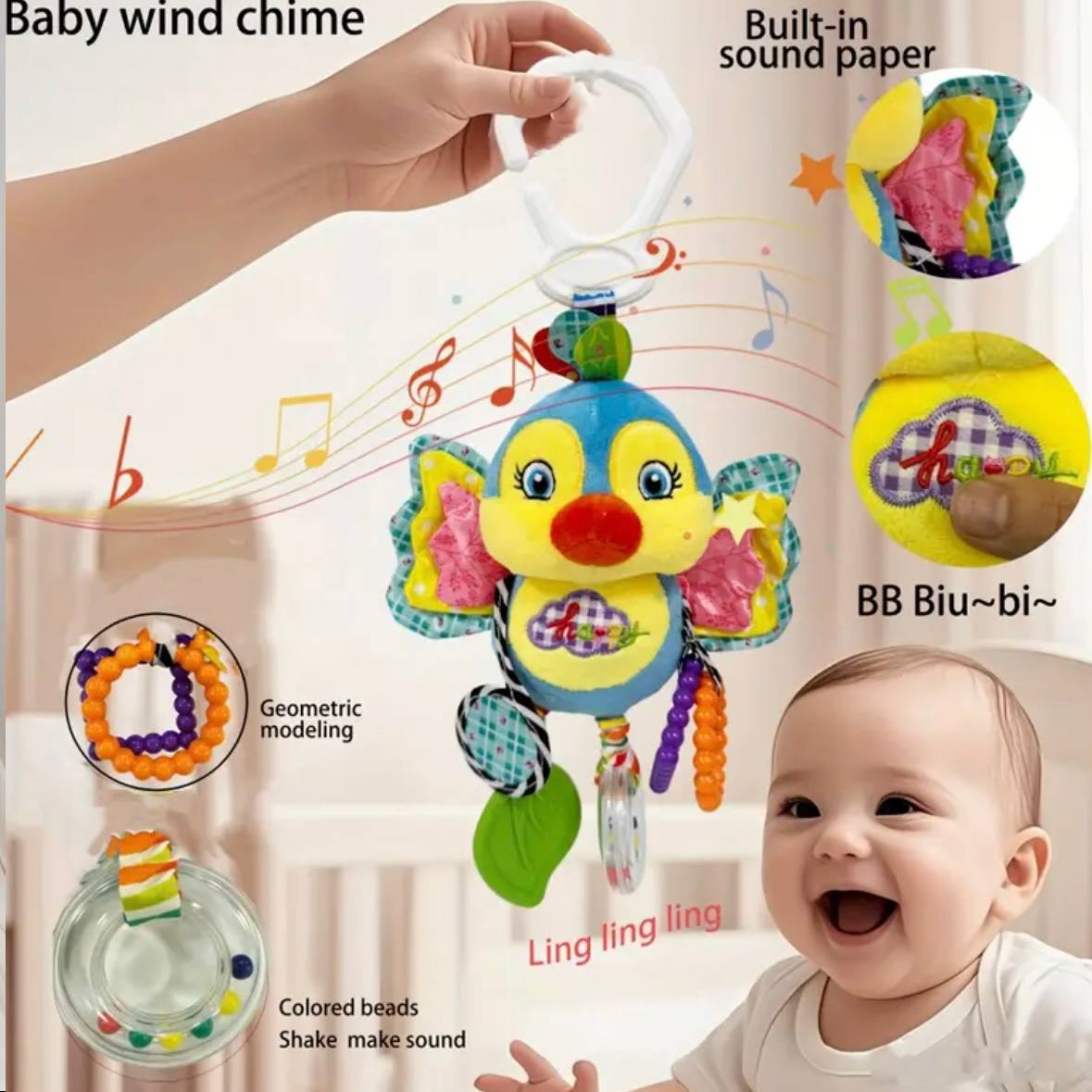 Zabawka wspiera rozwój sensoryczny i motoryczny dziecka. Idealna do zawieszenia na wózku, foteliku samochodowym lub łóżeczku. Wykonana z bezpiecznych, miękkich materiałów.