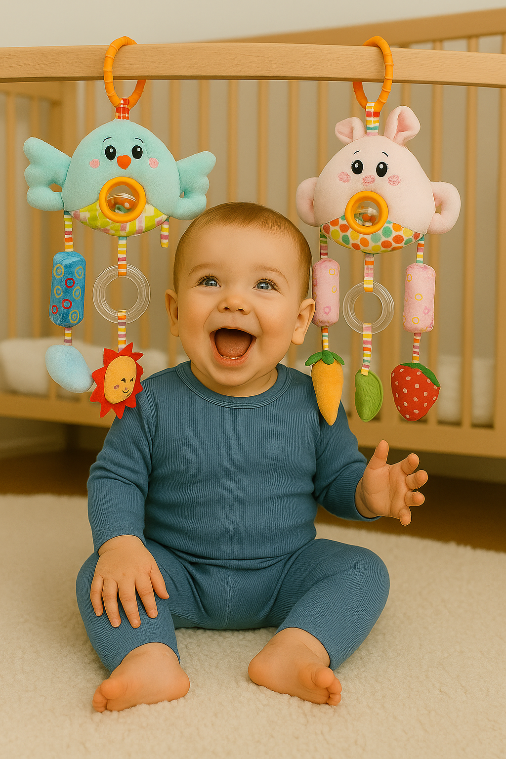 Idealna do zawieszenia w wózku, foteliku lub łóżeczku.
