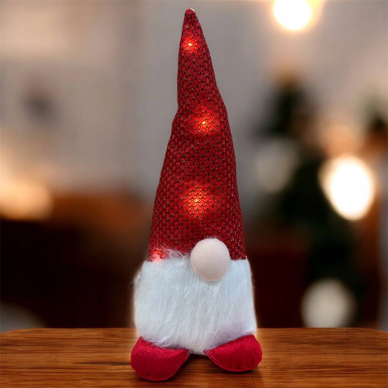 Figurka została wykonana z miękkich, przyjemnych w dotyku materiałów, z dużą dbałością o detale. Skrzat posiada klasyczny biały, puszysty zarost oraz okrągły nosek, które nadają mu uroczego i bajkowego wyglądu. Największym atutem dekoracji jest długa, stożkowa czapka z wbudowanym oświetleniem LED, emitującym ciepłe światło. Dzięki temu skrzat pełni nie tylko funkcję dekoracyjną, ale także subtelnie oświetla przestrzeń, tworząc nastrojowy efekt świetlny.