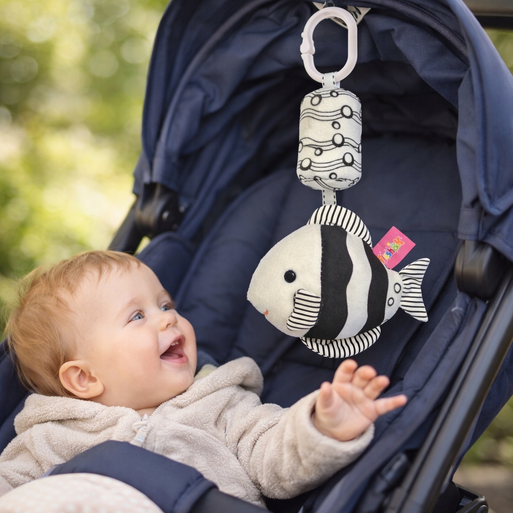 Kontrastowa zawieszka sensoryczna w kształcie uroczej rybki została zaprojektowana specjalnie z myślą o niemowlętach już od pierwszych dni życia. Czarnobiała kolorystyka wspiera rozwój wzroku dziecka, który w pierwszych miesiącach najlepiej reaguje na silne kontrasty. Miękka, przyjemna w dotyku pluszowa zabawka zachęca malucha do sięgania, chwytania i obserwowania, stając się jego pierwszym przyjacielem podczas spacerów i podróży.