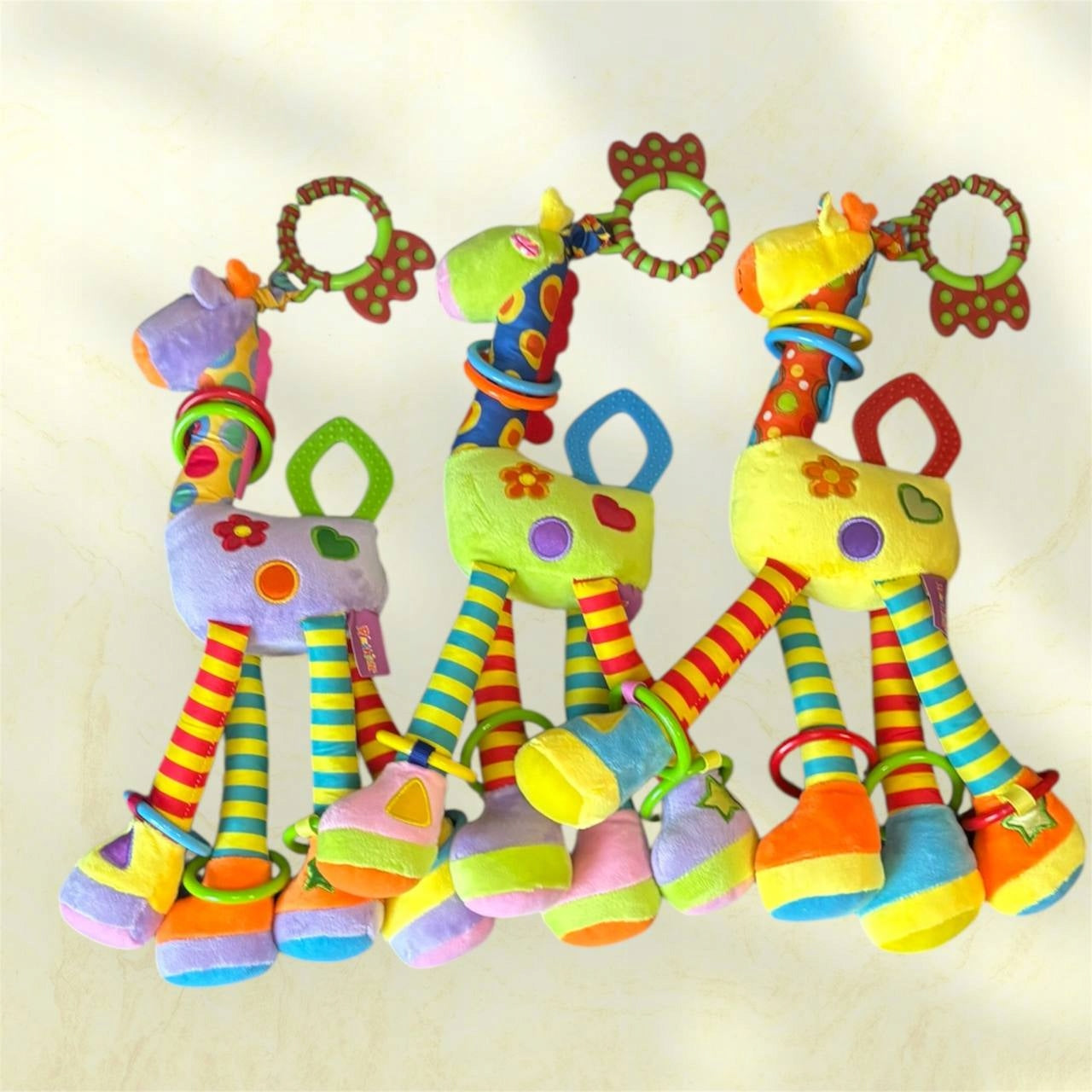 Kolorowa i miękka żyrafa inspirowana metodą Montessori, idealna zawieszka do wózka, fotelika i łóżeczka.